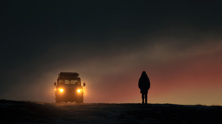 A silhouette of a person stands near a vehicle with glowing headlights set against a colorful twilight sky. The image displays a dramatic contrast of light and shadow, featuring an overall dark palette with hints of orange and red. The composition suggests travel, adventure, and exploration. Suitable for various editorial and commercial applications.