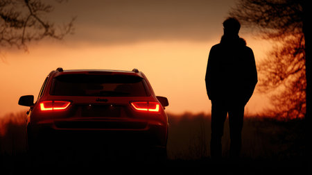 An image captures the silhouette of a person standing near a car. The scene is bathed in warm hues of an orange sunset. The composition features dramatic lighting and shadows, suggesting a contemplative or possibly isolated mood. This image could be used for various purposes, including editorial content or advertising.