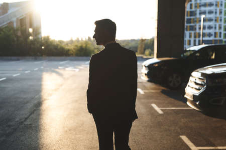 Silhoette of man in formalwear standing on parking lot with sunset in the background