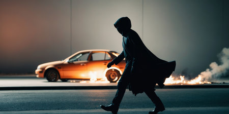 AI Generated. Hooded figure walking past burning car at night