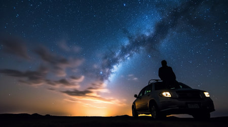 This image depicts silhouetted figures and a vehicle set against a backdrop of a vivid, star-filled night sky. The composition emphasizes the contrast between dark shapes and the bright, colorful galaxy above. Suitable for various uses, this image could be employed in editorial or promotional contexts.