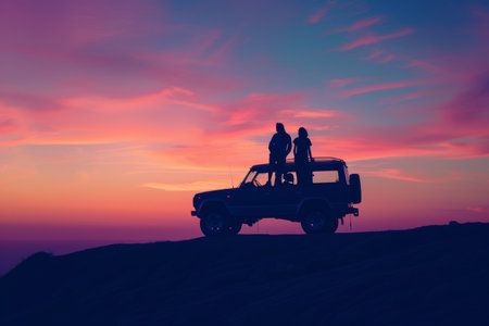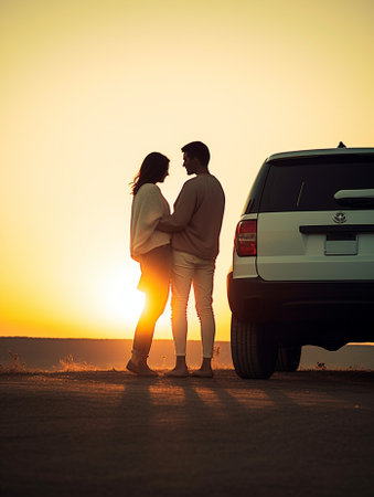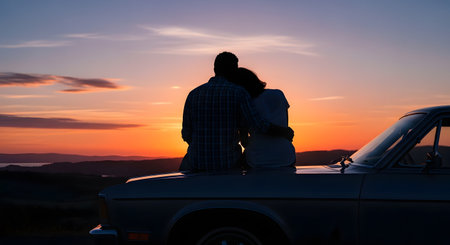 A silhouette of a couple sits on the hood of a car, leaning against each other while watching a breathtaking sunset. The colorful sky and scenic horizon create a romantic and adventurous atmosphere, perfect for travel and lifestyle concepts.