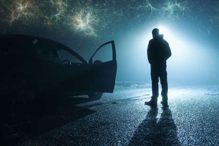 A man next to a car parked on the side of the road, underneath a street light, on a spooky country road. On a foggy winters night. With apocalyptic clouds of energy glowing in the sky.