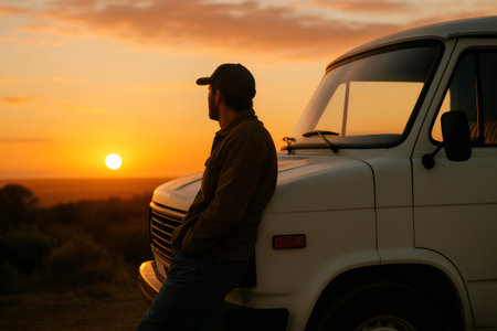 Man in a cap leaning on a classic white van, watching the setting sun over a vast landscape. Capturing freedom and travel
