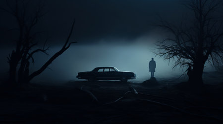 A missing person, ghost concept. Of a transparent man standing next to a car on a spooky winters evening. With a grunge, blurred edit
