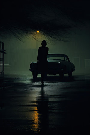 Silhouette of a man with a car in the rain at night