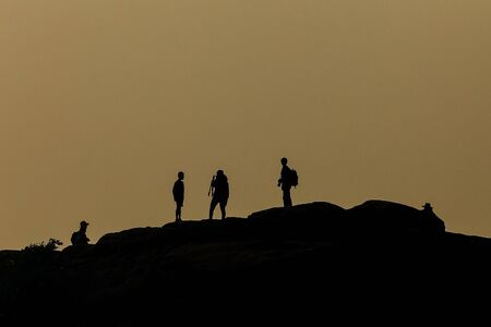 Silhouette of a professional landscape travel photographer holding a camera on a mountain. Silhouettes of many professional photographers posture in the evening