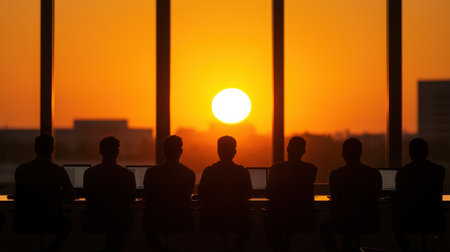 This image captures a group of silhouetted individuals gazing at a beautiful sunset through large office windows, creating a peaceful atmosphere.