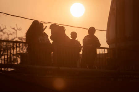 Silhouette of a group of people watching the sunset on the bridge.