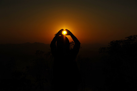 Closeup silhouette of woman hand holding sun rise in the morning, tourism concept