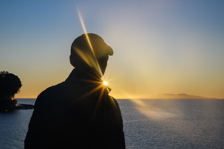 Silhouette of traveler in baseball cap on sunset sun background