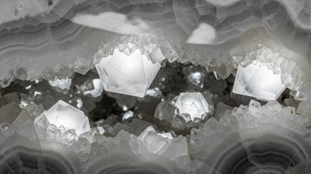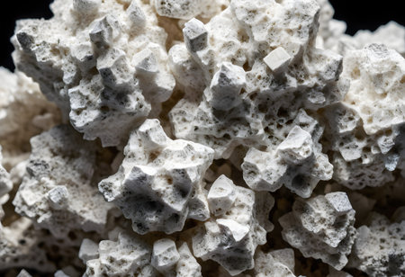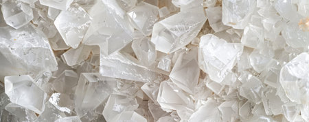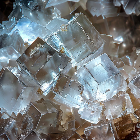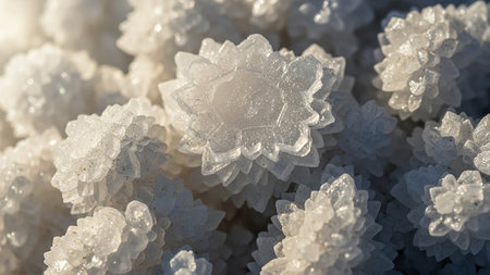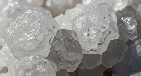 Macro view of sparkling white salt crystals forming intricate geometric shapes with a natural crystalline...