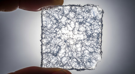 A person's fingers hold up a square, translucent piece of silica aerogel against a light source. The material's intricate, smoke-like internal structure is visible, demonstrating concepts of advanced materials science, innovation, and lightweight technology.