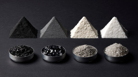 This image showcases an array of mineral powders and crystals in various textures and colors, artistically arranged on a dark surface. The contrast highlights their unique characteristics.