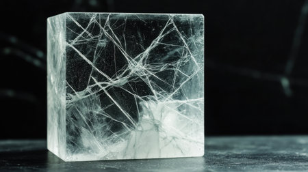 A stunning transparent cube featuring intricate fractures and veins that highlight its unique mineral composition. Perfect for artistic, design, or geological themes.