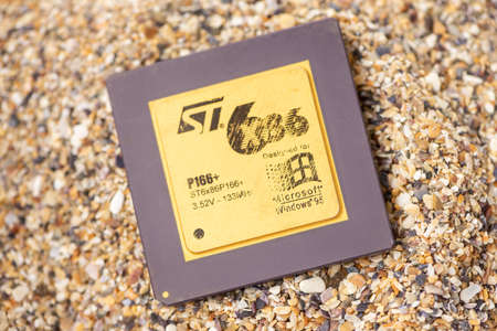 Timisoara, Romania - October 17, 2020: Close-up of a ST6x86P166+ processor, 133Mhz, socket 7 with sand in the background.