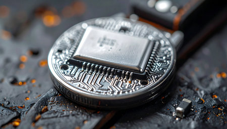 A detailed macro photograph captures the intricate heart of modern technologya central processing unit. Set against a rugged, industrial backdrop, the complex network of circuits on the circular board symbolizes the immense power of data processing, artificial intelligence, and the interconnected digital future.