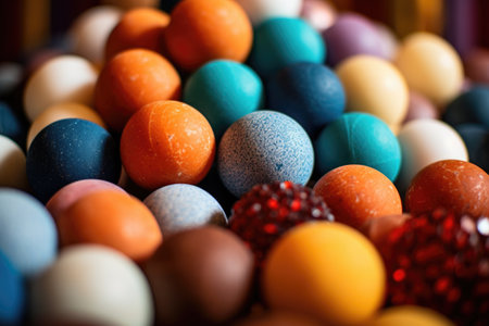 A vibrant collection of colorful decorative balls arranged together, showcasing a variety of textures and hues, creating a playful and eye-catching composition.