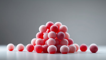 AI Generated. Stack of Soft Candy Balls with Red Fruit Filling on a Gray Background in Studio Lighting