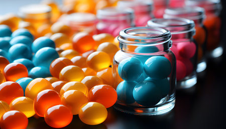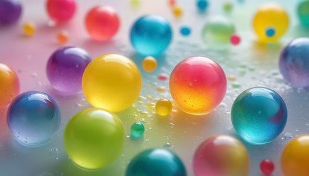 Colorful jelly balls scattered on the table as transparent decorative spheres. Tasty dessert and food and drink backgrounds
