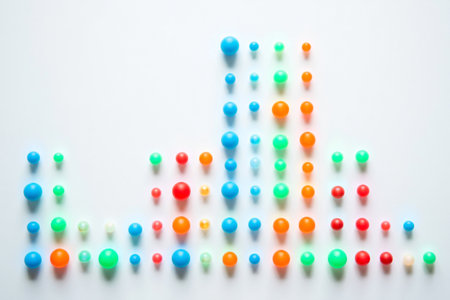 A variety of pastel geometric shapes including spheres and smaller elements are meticulously arranged on a white surface. The composition features a vibrant mix of colors with ample space for text.