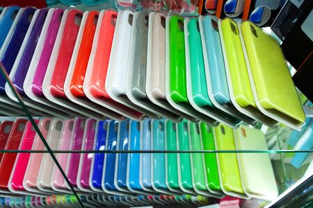 Multi-colored cases for the smartphone on a shop window. Choosing case for your smartphone.