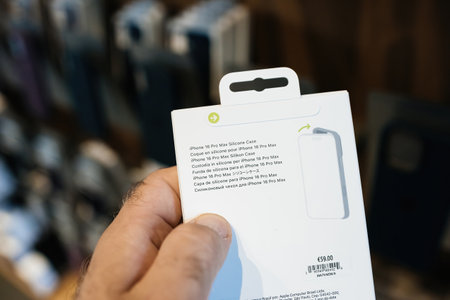 Paris, France - Sep 20, 2024: POV of a male hand shopping in the Apple Store for the latest iPhone 16 Pro Max silicone case, highlighting new Apple accessories