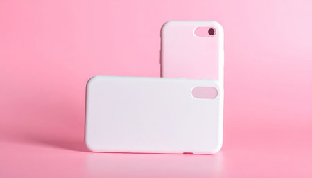 Two white smartphone cases are arranged on a vibrant pink background, one lying flat and the other standing upright.