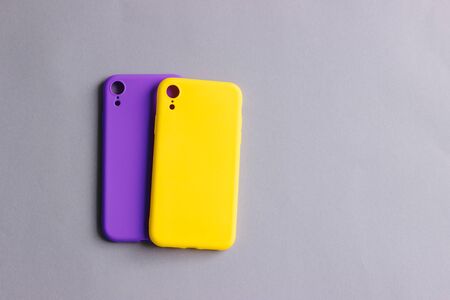 Colorful silicone cases for your smartphone. Bright yellow and purple silicone cases for smartphone. Flat lay.