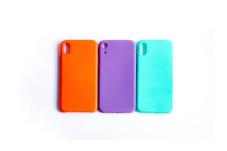 Mint, orange and purple cases for the smartphone on the white background. Protective silicone cases for smartphone. Colorful silicone cases for your smartphone. Isolated image, selective focus.