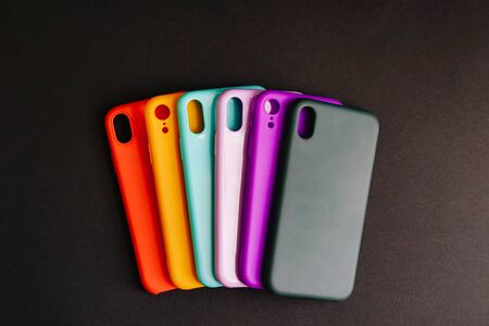 Yellow, red, purple, lilac, green, mint cases for the smartphone on the black background. Protective silicone cases for smartphone. Colorful silicone cases for your smartphone. Selective focus.