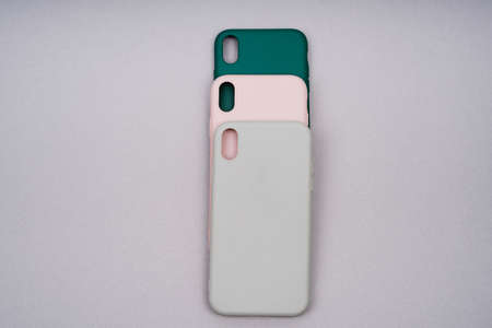 Gray, green and pink smartphone cases. Smartphone in a gray silicone case. Protective covers for the smartphone.