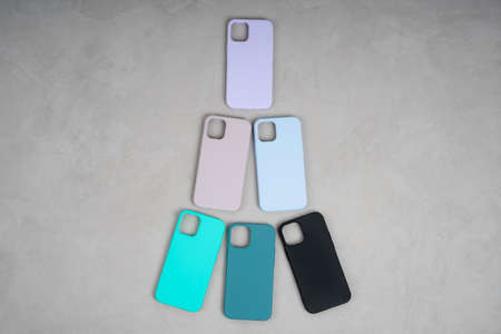 Set of colored silicone cases for smartphone. Cases set for smartphone on gray background. Protection for mobile phone. Colorful silicone phone cases.