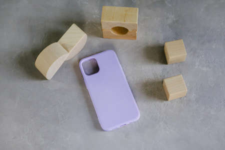 Lilac silicone case for smartphone on a gray textured background. Color concept - very peri color of the year 2022.
