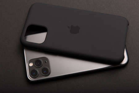 Milan, Italy - December 17, 2019: close up on a brand new Apple iPhone 11 Pro on a black background. Devise in unboxed and a plastic cover lies close to it.