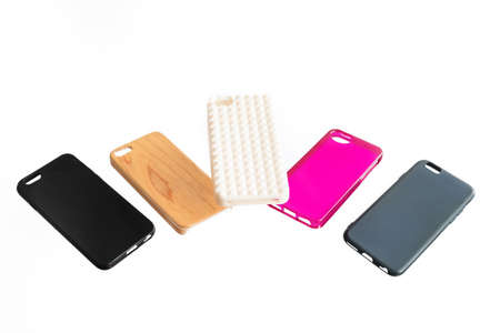 Pile of multicolored plastic back covers for mobile phone levitating on white background. Choice of smart phone protector case accessories background. Silicone phone backs.