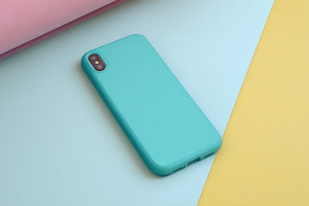 Close-up shot of a turquoise smartphone with a textured case placed on a split-color background in soft pastel tones of pink, blue, and beige. The clean and modern aesthetic makes it ideal for advertising mobile accessories, minimalist product showcases, or tech-themed visuals