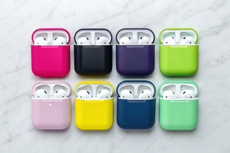 Earbuds showing assortment of colorful earbud cases with wireless earbuds on marble surface keywords: earbuds, wireless, audio, technology, accessory, case, charging case, colorful, vibrant,...
