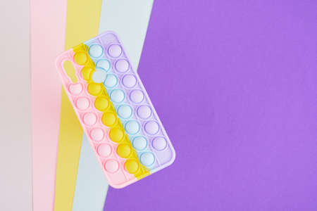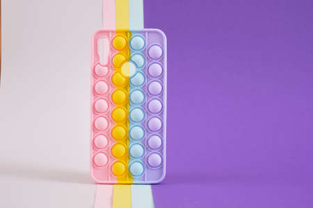 colorful bright case for a smartphone in the form of a trendy trendy antistress toy on a multicolored geometric background, copy space, mock up