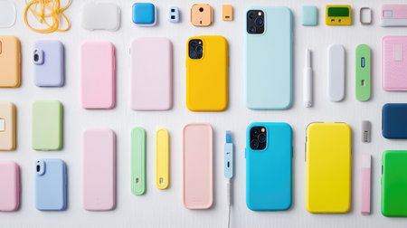 A vibrant collection of colorful smartphone cases and accessories arranged neatly on a white background, emphasizing modern design and creativity.