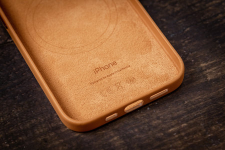 Antalya, Turkey - October 28, 2021: Newly designed Golden Brown MagSafe leather case for Apple iPhone 13 Pro on wooden background