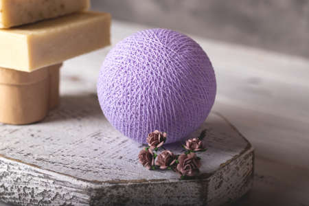 Decorative lilac ball wrapped, intertwined, interlaced, coiled in threads on rustic wood podium near the paper flowers and handmade soap. Closeup, selective focus