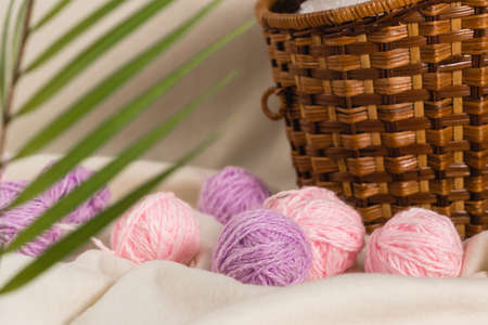 Balls of pink and lilac yarn lie next to a wicker basket. home needlework. handmade work. selective focus
