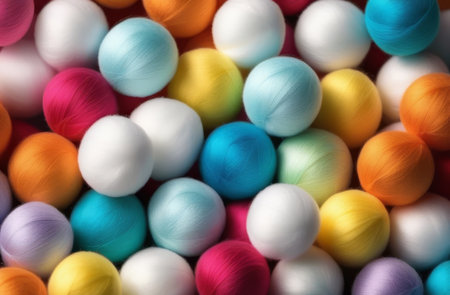 Close up of colorful wool yarn balls, wool toy to play, in a blurred background
