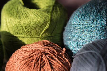 Several skeins of yarn in different colors close up