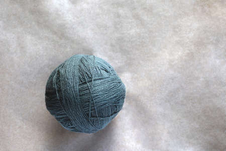 One blue ball of woolen thread with long twisted thread on a light blue background with copy space