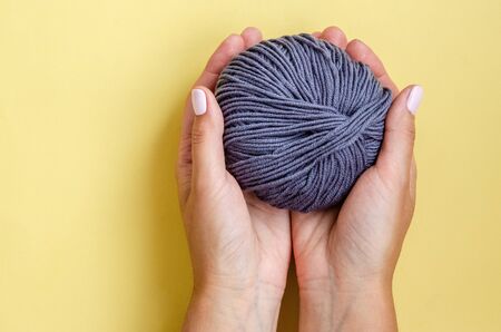 Close up of female hands holding a ball of gray colored natural wool threads on a yellow background. Hobbies, winter, autumn, with copy copy space, flat lay. View from above