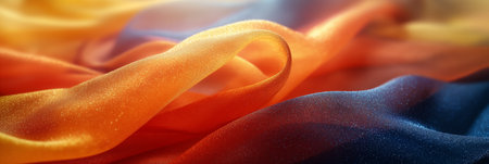 Flowing silk fabric in vibrant orange, blue, and pink hues creates a soft, wavy texture against a gentle background, showcasing its delicate beauty and fluidity.