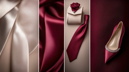 A stunning collection of elegant burgundy accessories, including silk ties, satin shoes, and a decorative rose, perfect for special occasions and formal events.