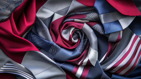 This image showcases a beautifully arranged swirl of textile fabric in rich colors and intricate patterns, perfect for fashion and design projects.